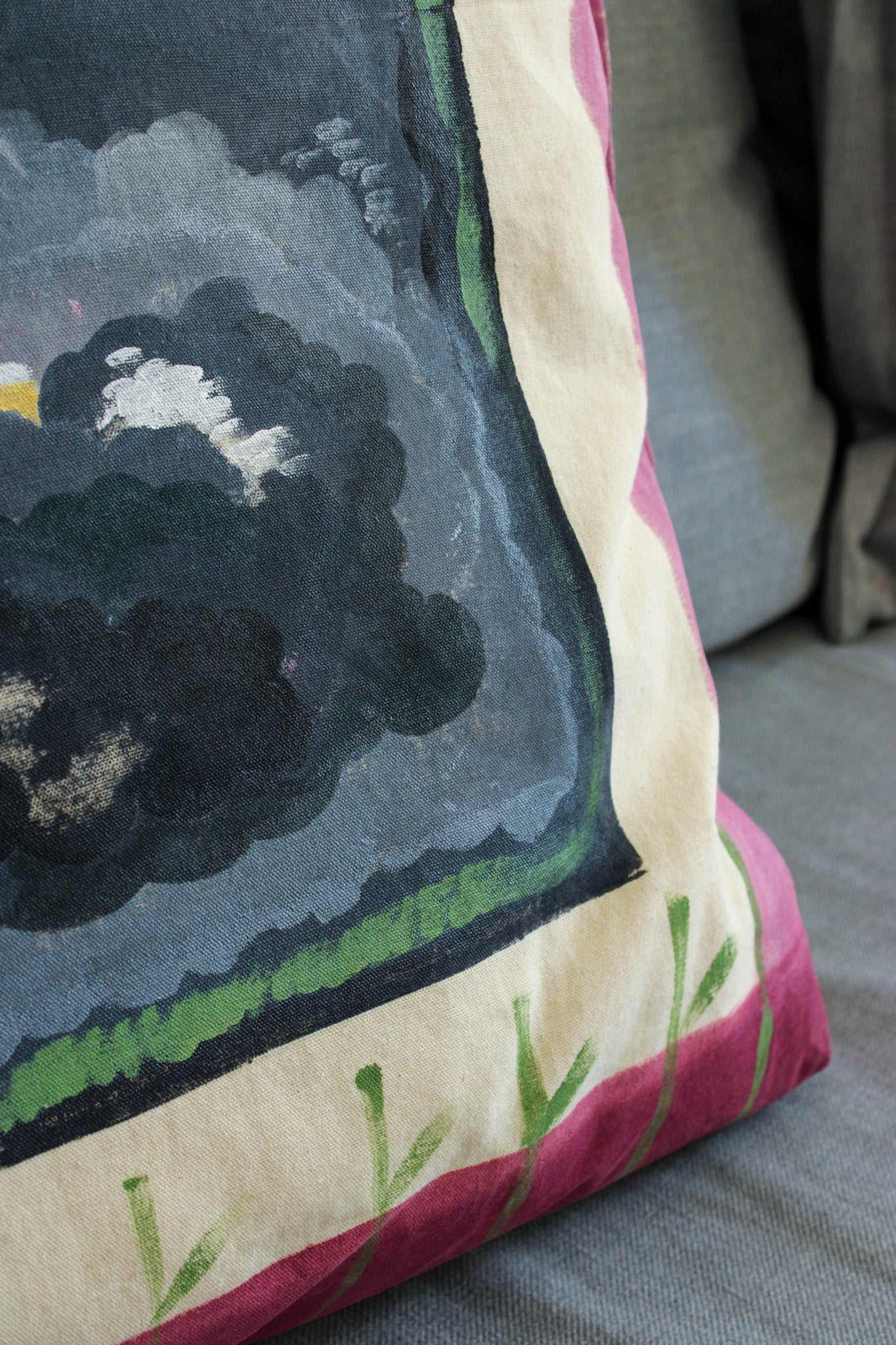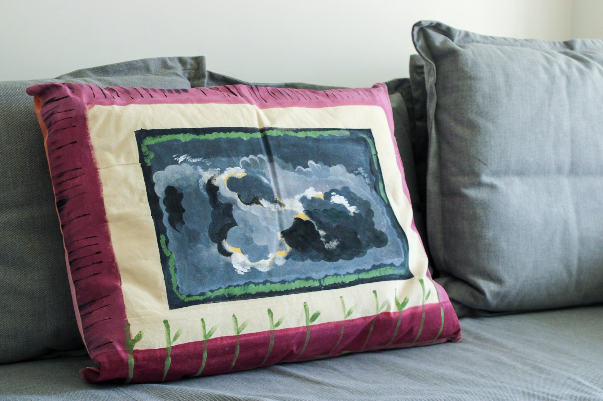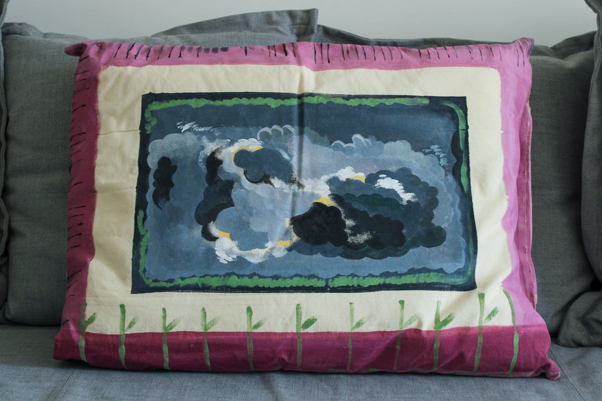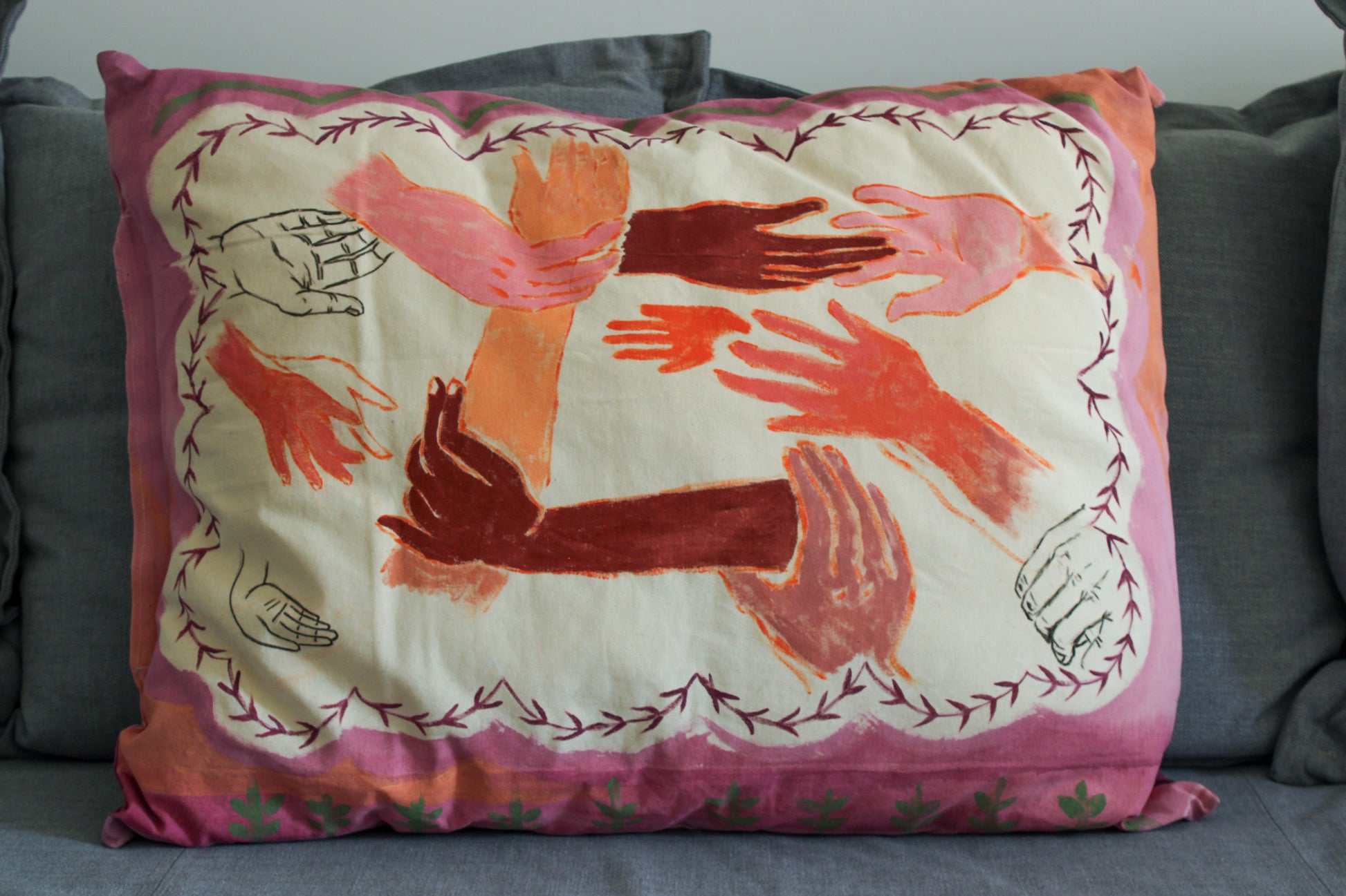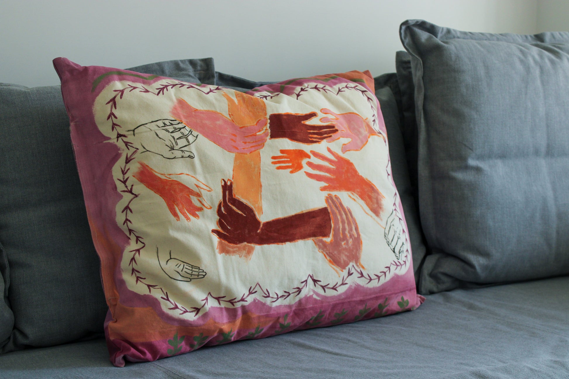 Cuscino artistico in puro cotone dipinto a mano con colori acrilici. Sul fronte un intreccio di mani che si afferrano e si cercano, come a trovare un sostegno reciproco, si contrappone al retro in cui prevalgono toni più scuri che ricordano le nuvole plumbee cariche di pioggia. Uno squarcio di luce penetra tra le ombre. Questo cuscino è una metafora di come potere dell’ unità e dell’amicizia riesce a dissolvere il senso di solitudine e impotenza. La cornice violacea è adornata da tante piantine verdi, simbolo di crescita e speranza. Ogni cuscino è un pezzo unico, firmato e numerato al suo interno.
