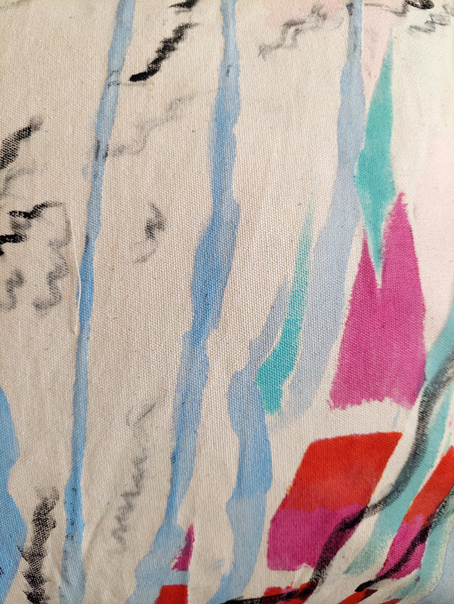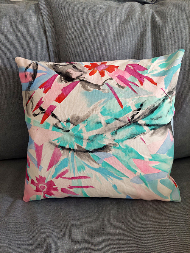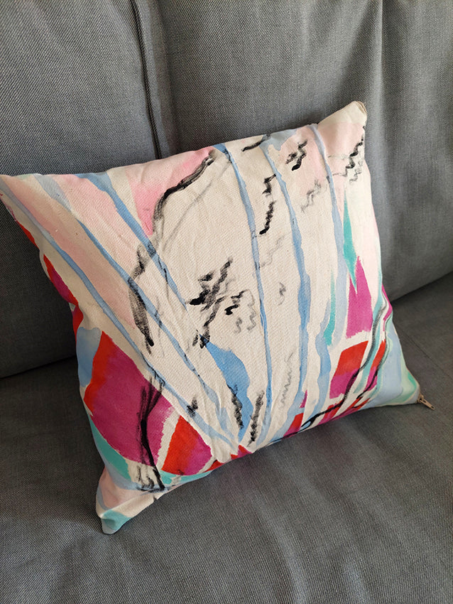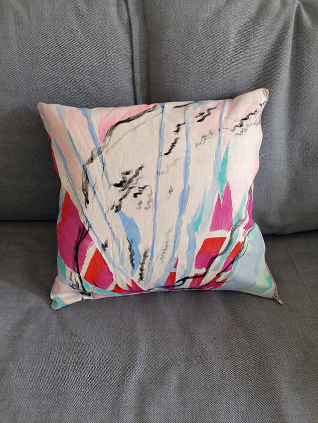 Cuscino artistico in puro cotone dipinto a mano con acrilici mescolati a colori per tessuti. I motivi astratti e dinamici richiamano la superficie di un vetro frantumato, che toccato dalla luce riflette in maniera irregolare i colori e le forme di tutto ciò che lo circonda. Il fronte lascia spazio ai toni chiari e i tagli azzurri si irradiano fino a sparire. Sul retro della tela l' occhi dell' osservatore si distanziano dai dettagli e osservano la caleidoscopica composizione, che si trasforma in un esplosione di fiori astratti. Ogni cuscino è un pezzo unico, firmato e numerato al suo interno.