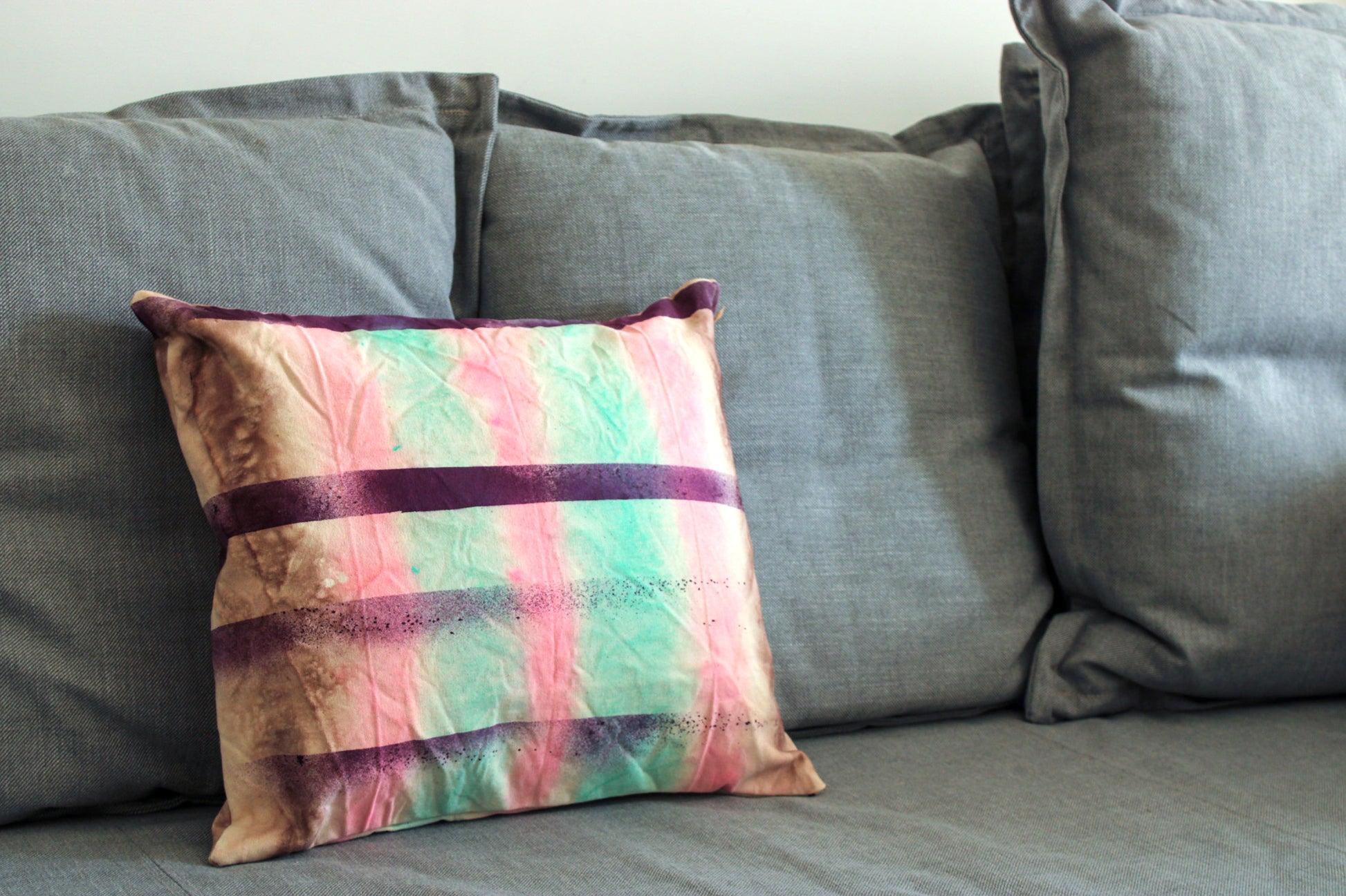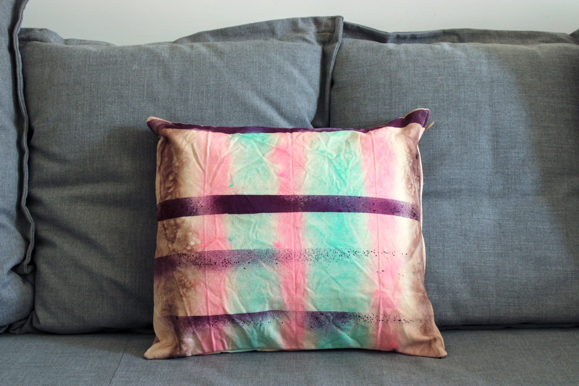 Cuscino artistico in puro cotone dipinto a mano con colori acrilici mescolati a colori per tessuti. Strisce orizzontali nei toni del viola intenso, si intersecano a bande verticali irregolari rosa e verde acqua, dando forma ad una griglia sfumata che richiama i tramonti sulle onde del mare. Interamente dipinto a mano su una tela di 100% cotone, il cuscino è sfoderatile, con chiusura zip, è perfetto per chi desidera aggiungere personalità, colore e arte agli spazi di casa. Ogni cuscino è firmato e numerato al suo interno.